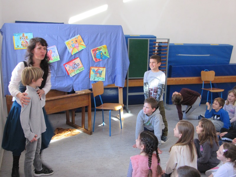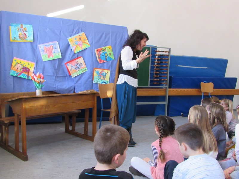 Posve u skladu sa svojim renomeom svestrane umjetnice (slikarica, ilustratorica, izrađuje lutke…) razigrala je maštu učenika i njihovih učitelja. Druženje je započelo pripovijedanjem bajke, a vrlo brzo aktivno je uključila sve prisutne u prepričavanje i dramatizaciju. Nadamo se da je naša vesela gošća uživala barem koliko smo i mi uživali u druženju s njom!